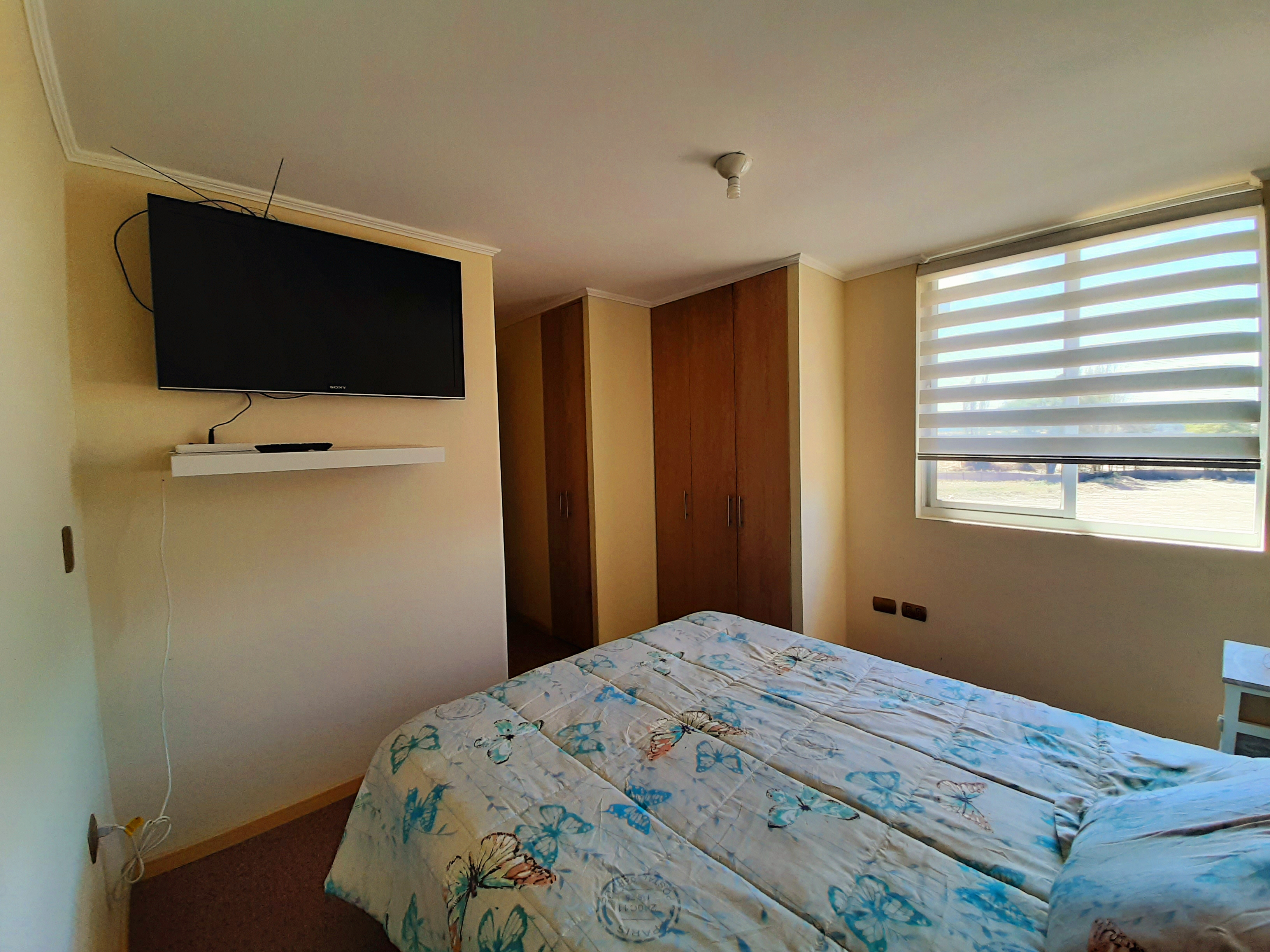 DORMITORIO PRINCIPAL EN SUITE , CON CAMA DE 2 PLAZAS , VELADORES , TELEVISIÓN .